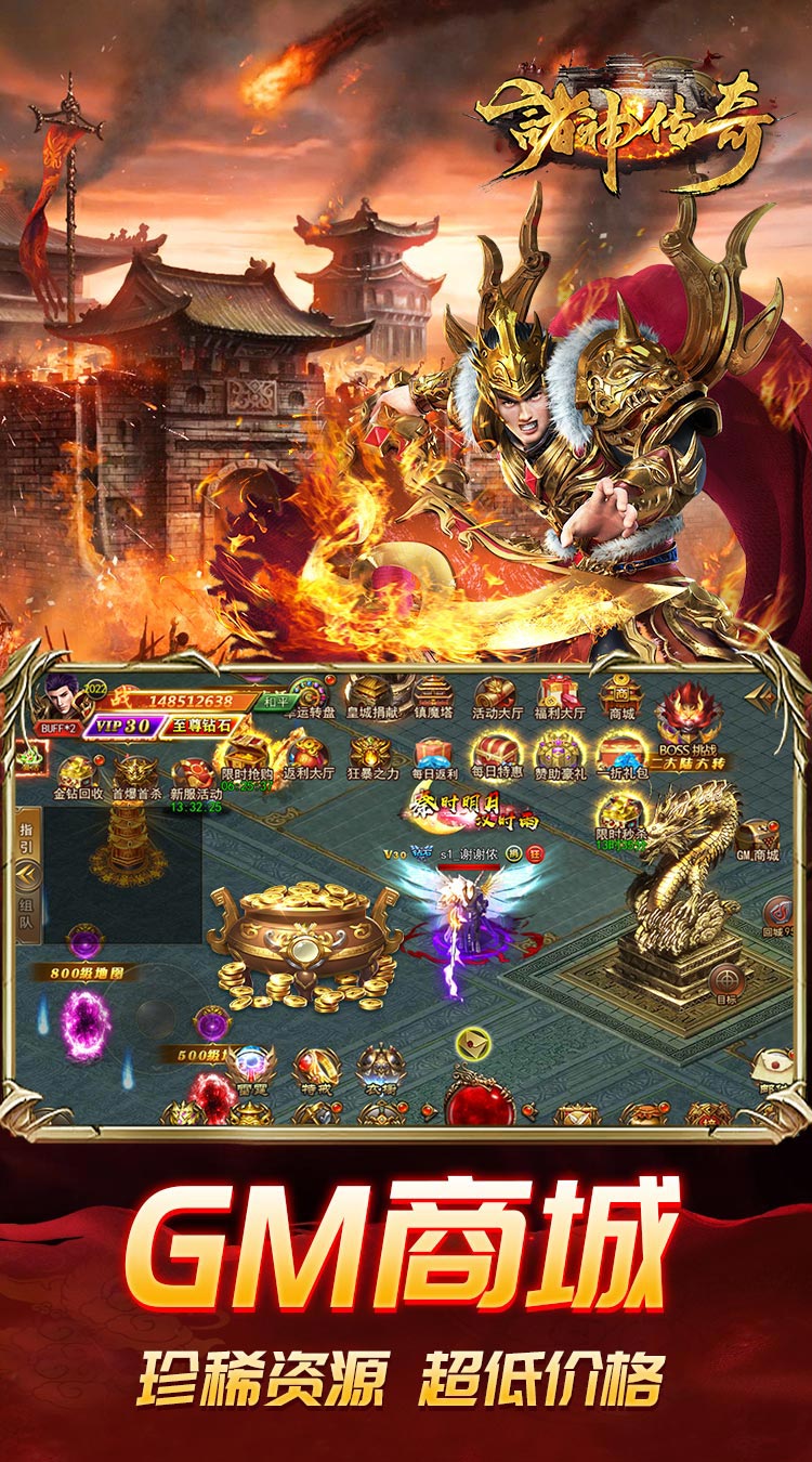 ★上线即送满级VIP,强力武器,攻速时装 ★黄金爵位特权免费升,轻松提高BOSS爆率 ★每档充值首充高达三倍赠送,续充还有双倍享 ★跳楼价珍稀材料每日可购,一切尽在GM商城 ★全屏一键拾取,不再担心挂机漏检装备材料