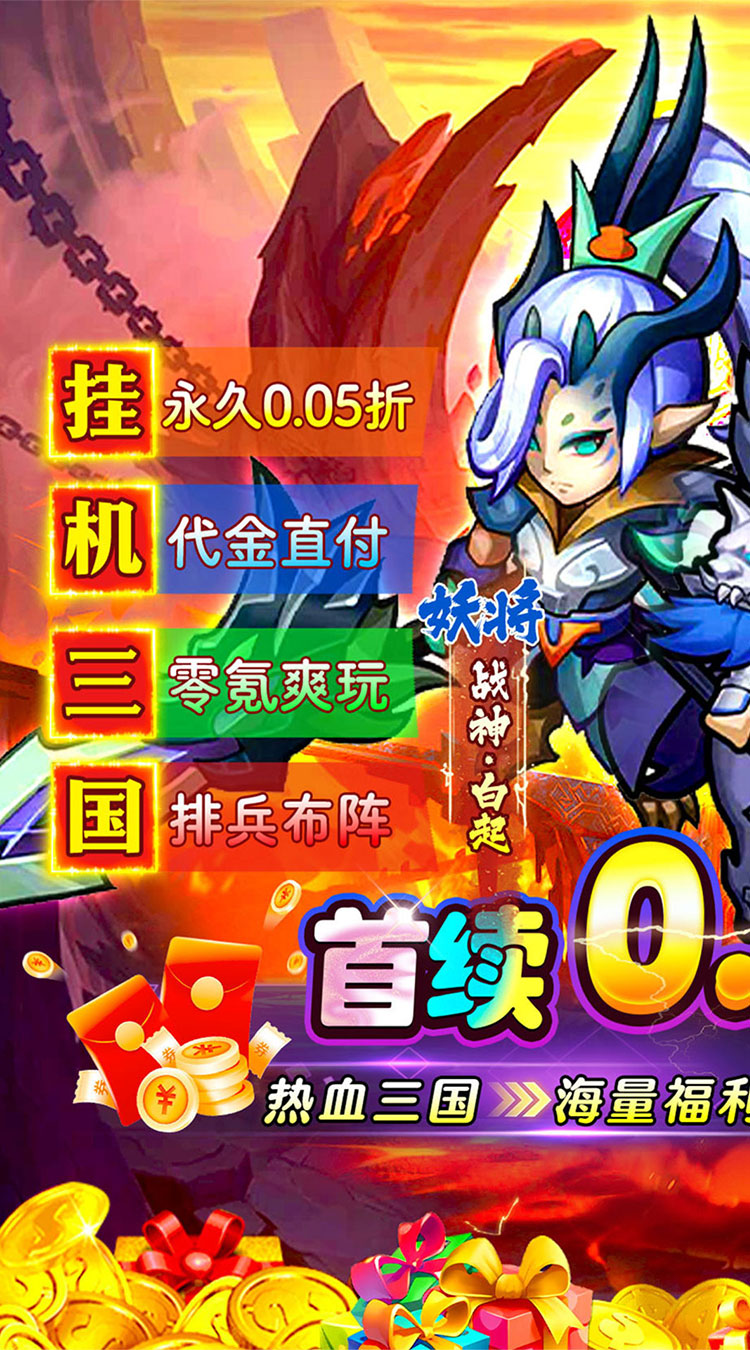 【三国0.05折】开局即享0.05折永久充值,三国放置手游,轻松畅玩; 【红包兑换】每日红包兑换无限送!真充拿到手软! 【七日狂欢】七日等级送顶级7星神将“关羽”,先发制人,决胜千里; 【新角好礼】创角赠送7星猛将“张辽”,千万货币; 【乱世三国】召唤武将,排兵布阵,攻城掠地,热血三国,携手并进,角逐国战;