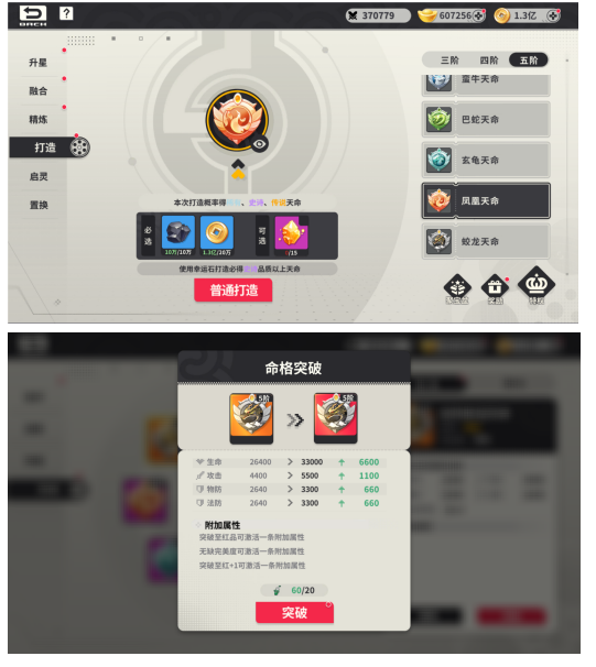 玩家可以通过打造材料获得对应天命,同时可以装备天命来提升数值。天命采用换代形式,不同等级装备的天命阶数是不一样的。同时天命可以进行强化和突破,提升天命属性。